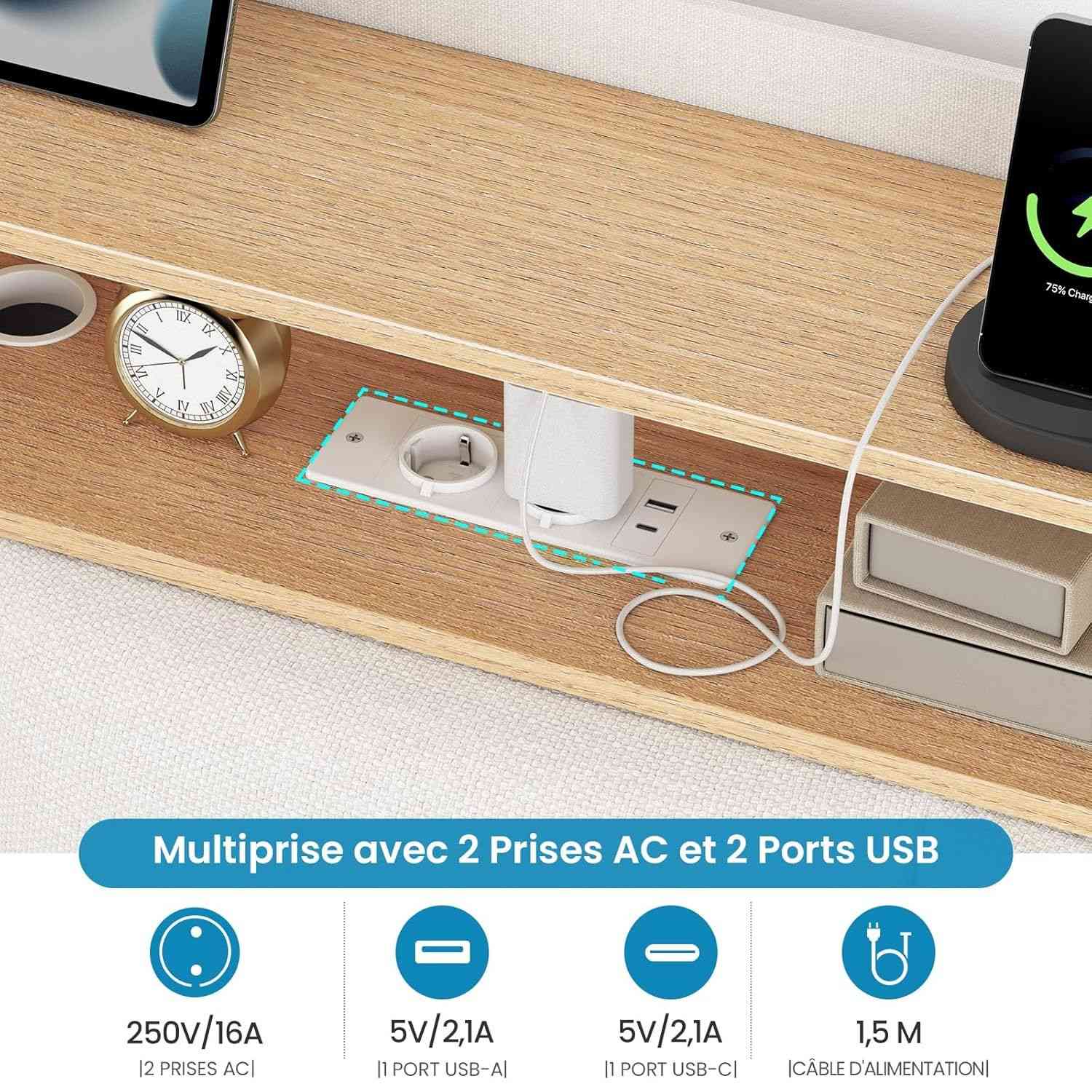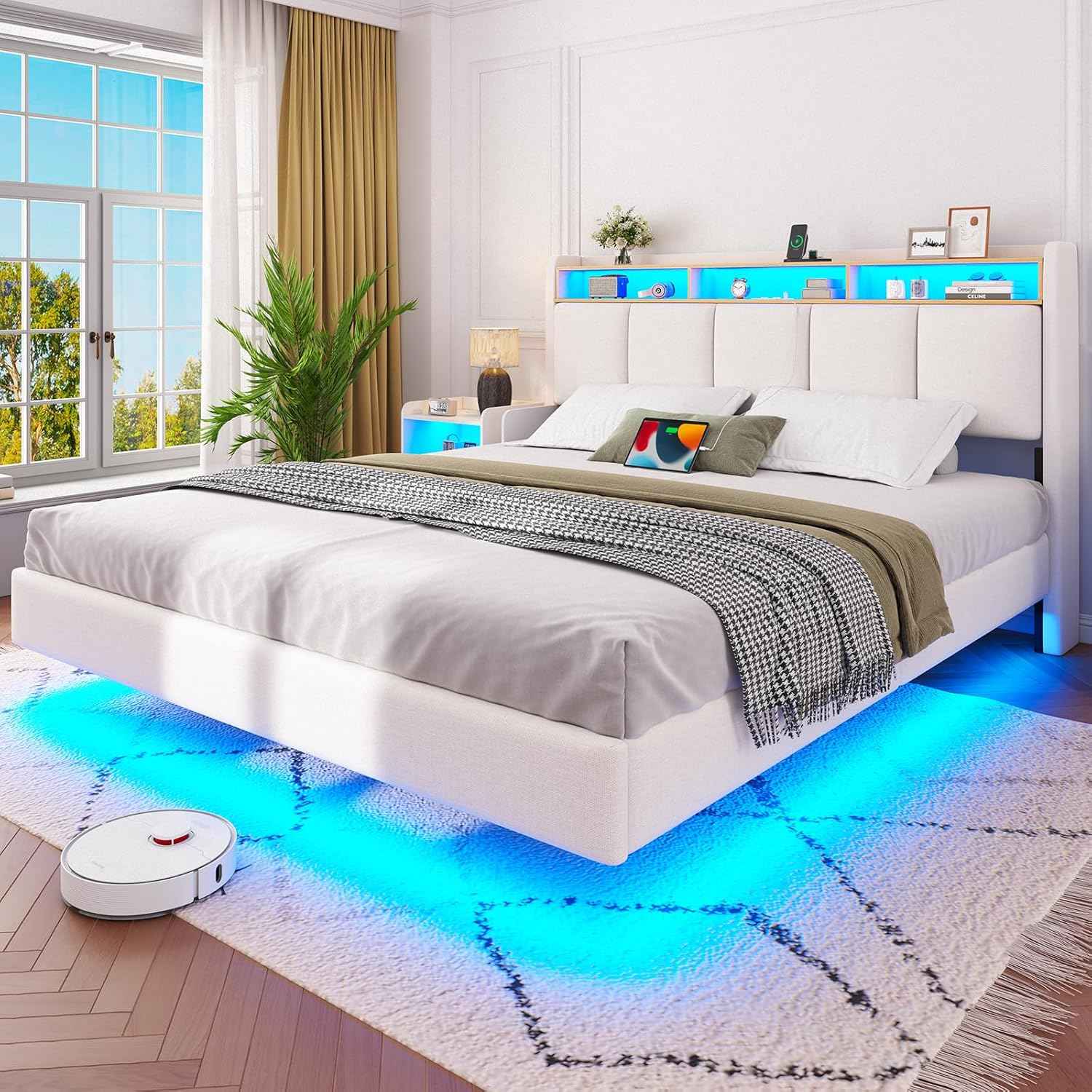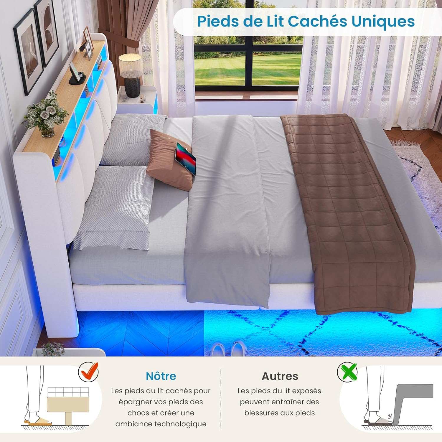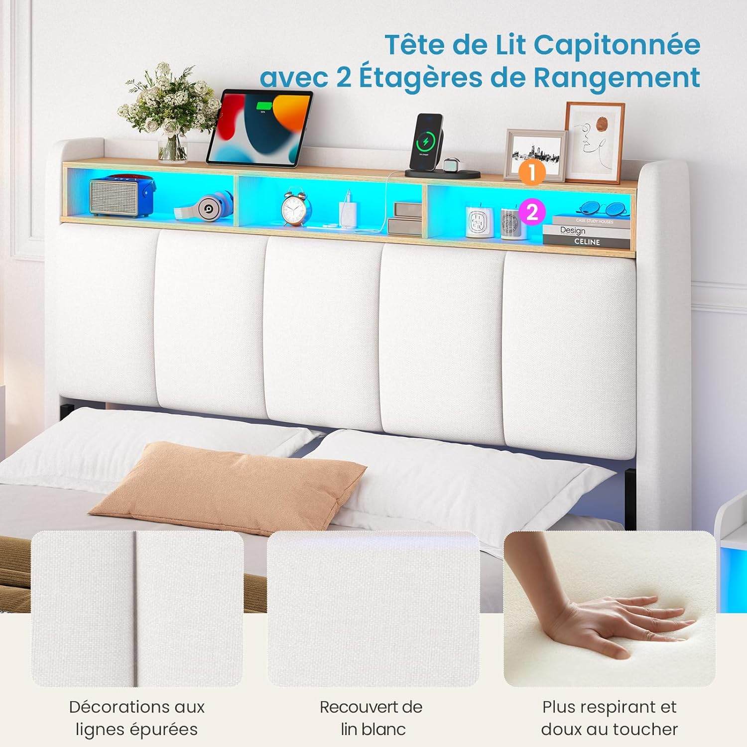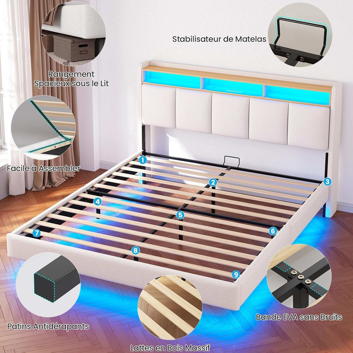 Cadre de Lit Flottant avec Éclairage LED Multiprise Tête de lit Rembourrée avec Rangement Tissu en Lin Blanc