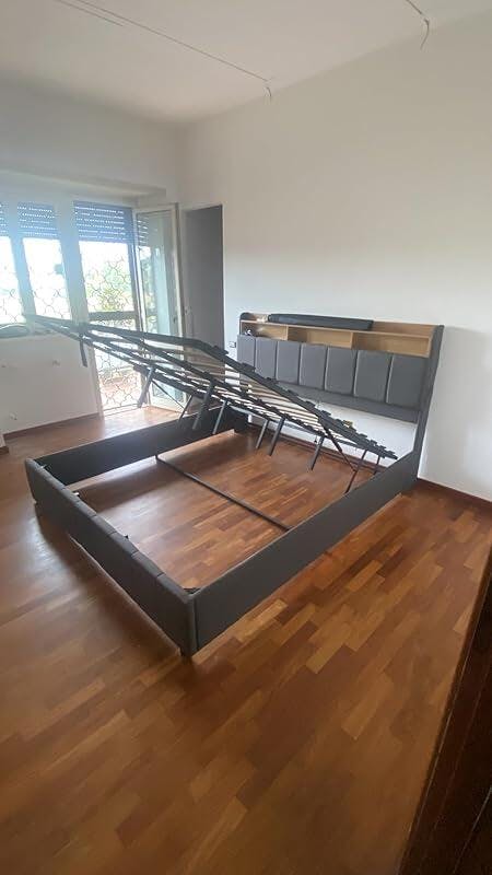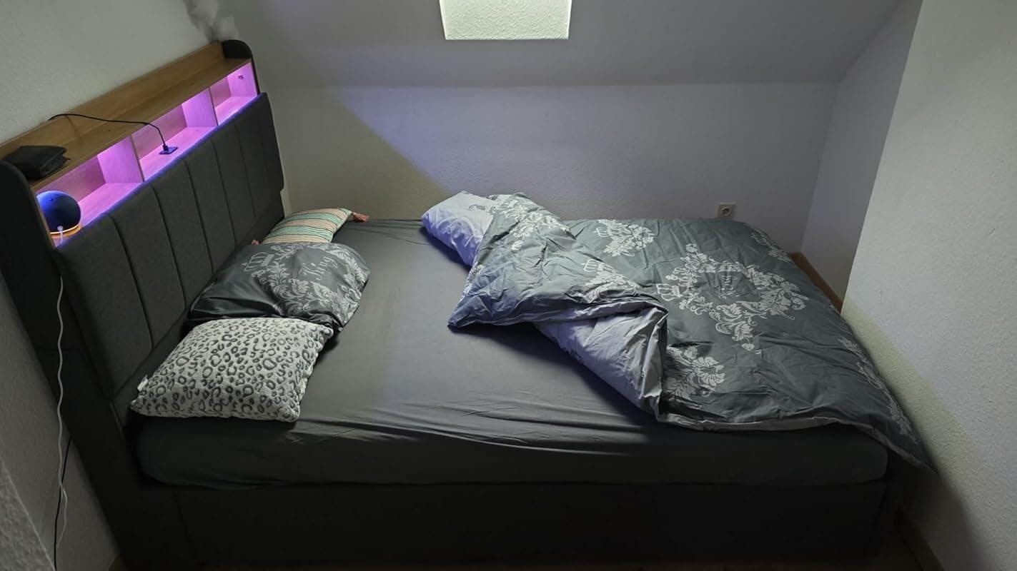 LED Lit 2 Personnes en PU avec Tête de Lit Capitonné Étagères Ouvertes et Rangement Caché Blanc