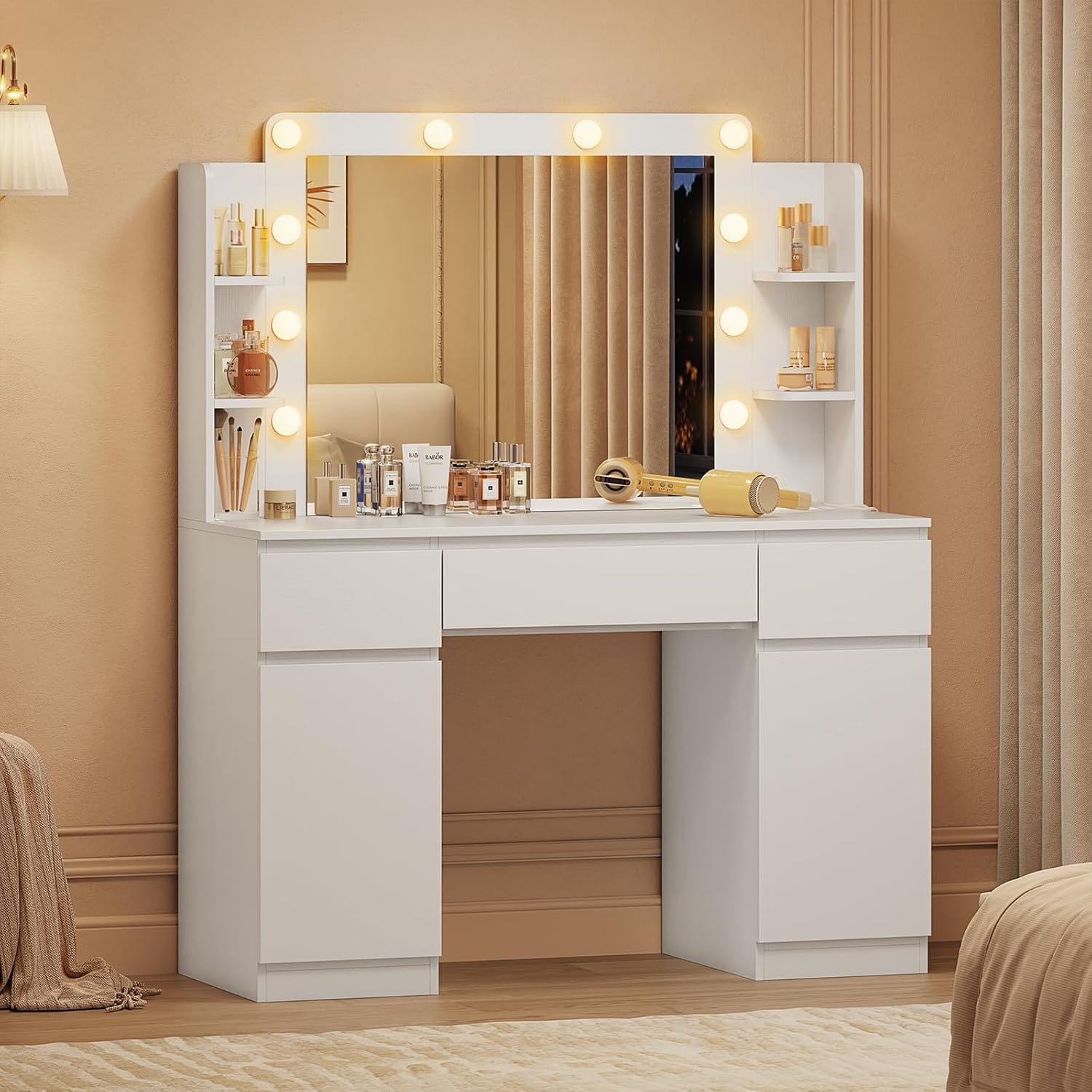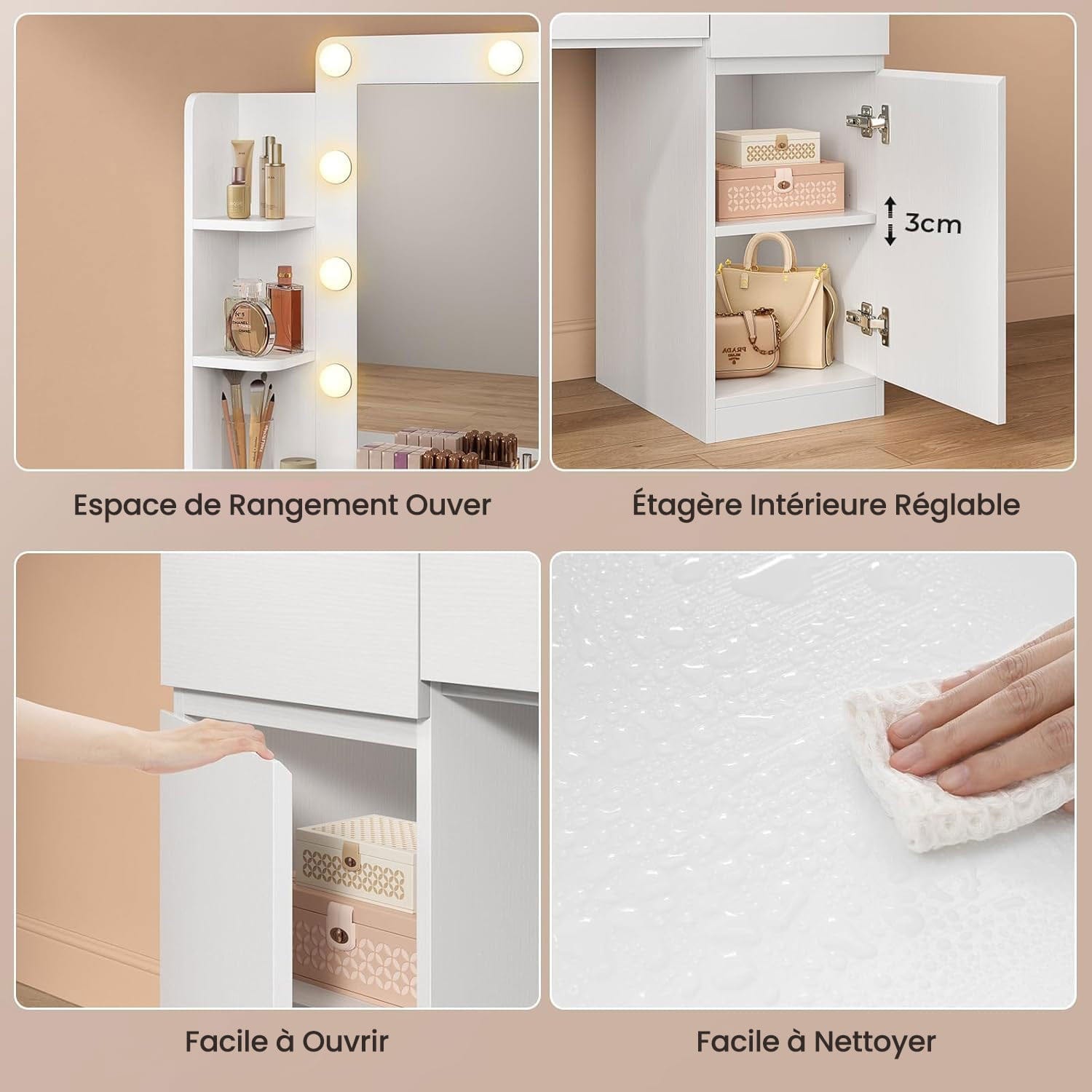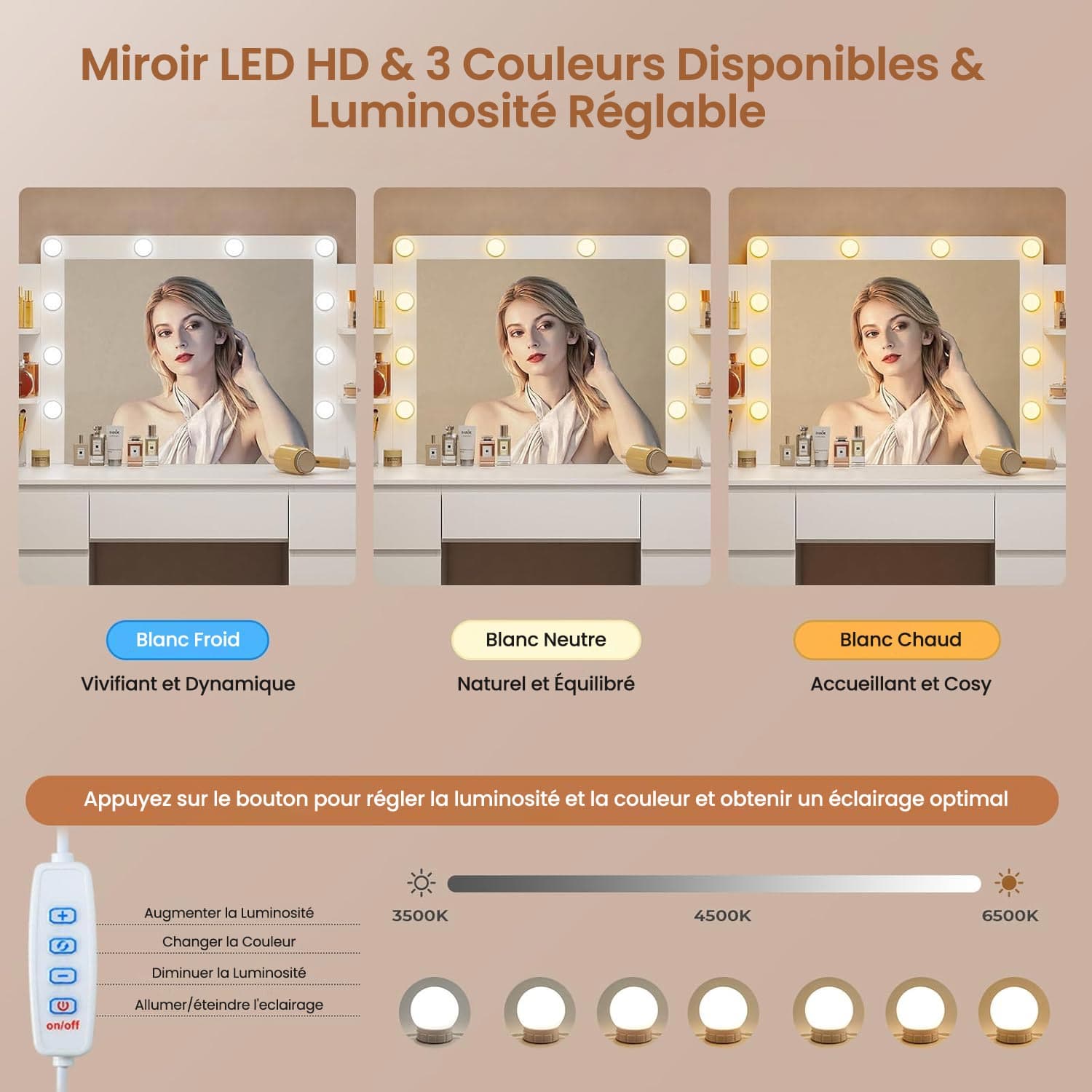 Coiffeuse avec Miroir 10 Ampoules LED Réglables Multiprise 3 Tiroirs 2 Armoires et 6 Étagères Ouvertes Blanc