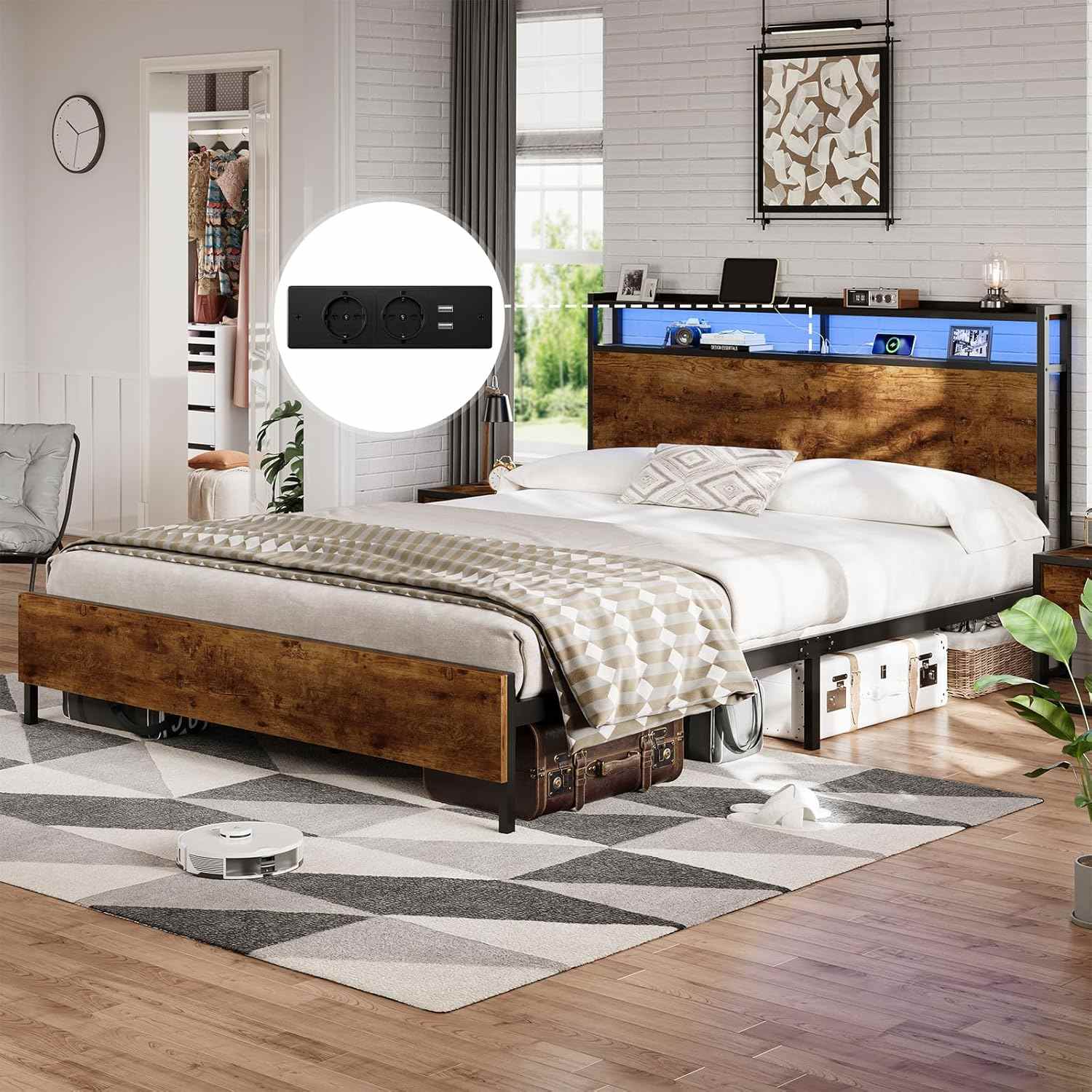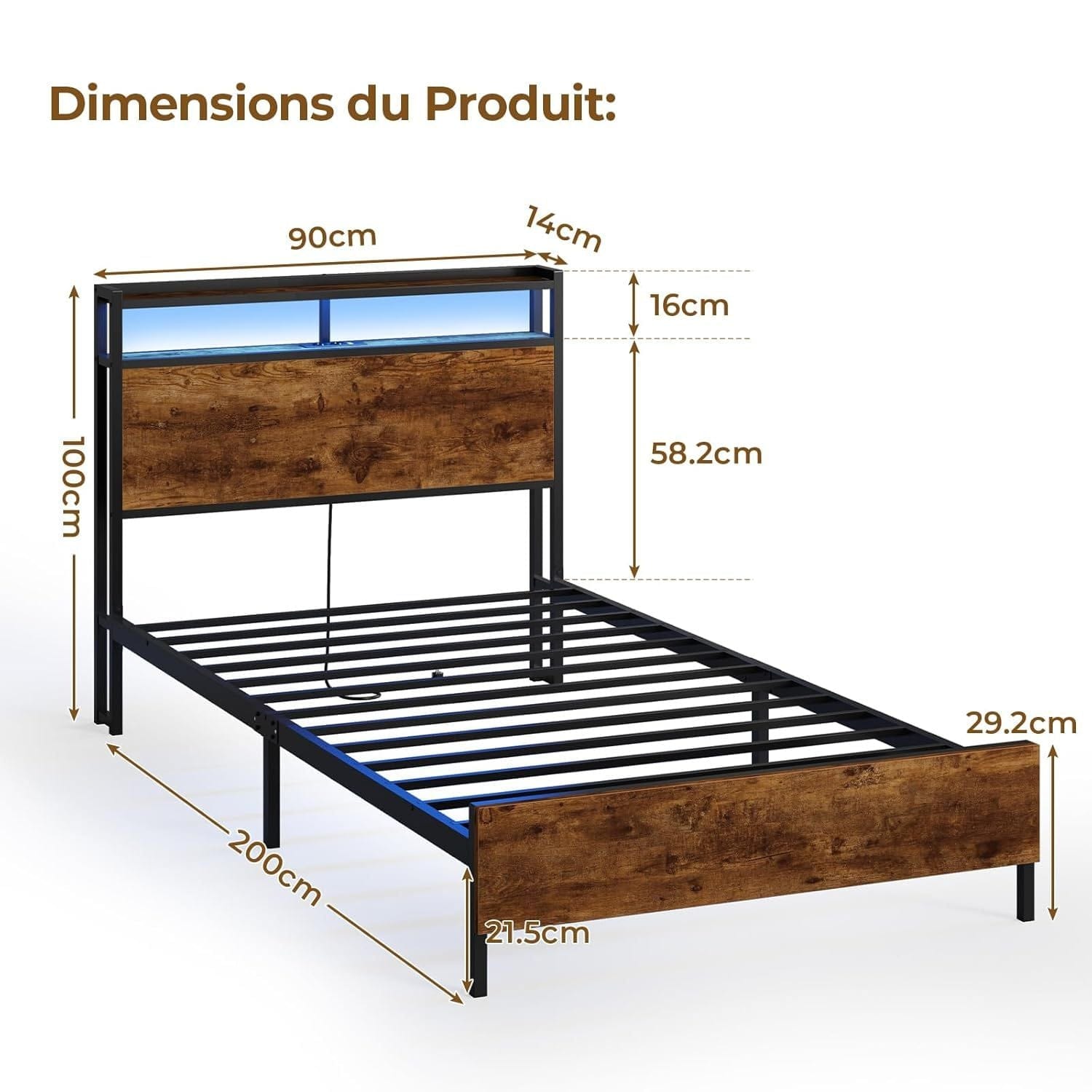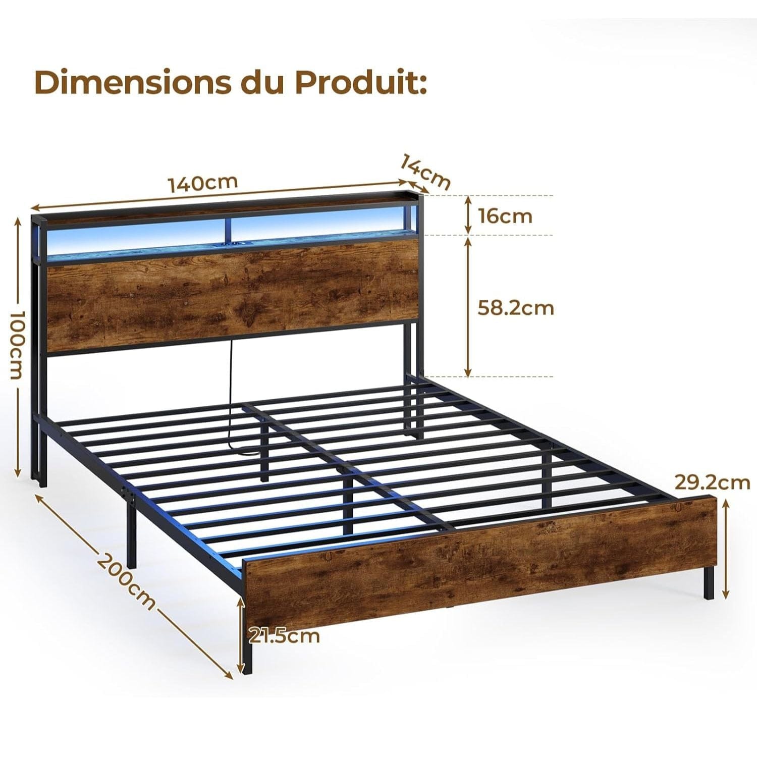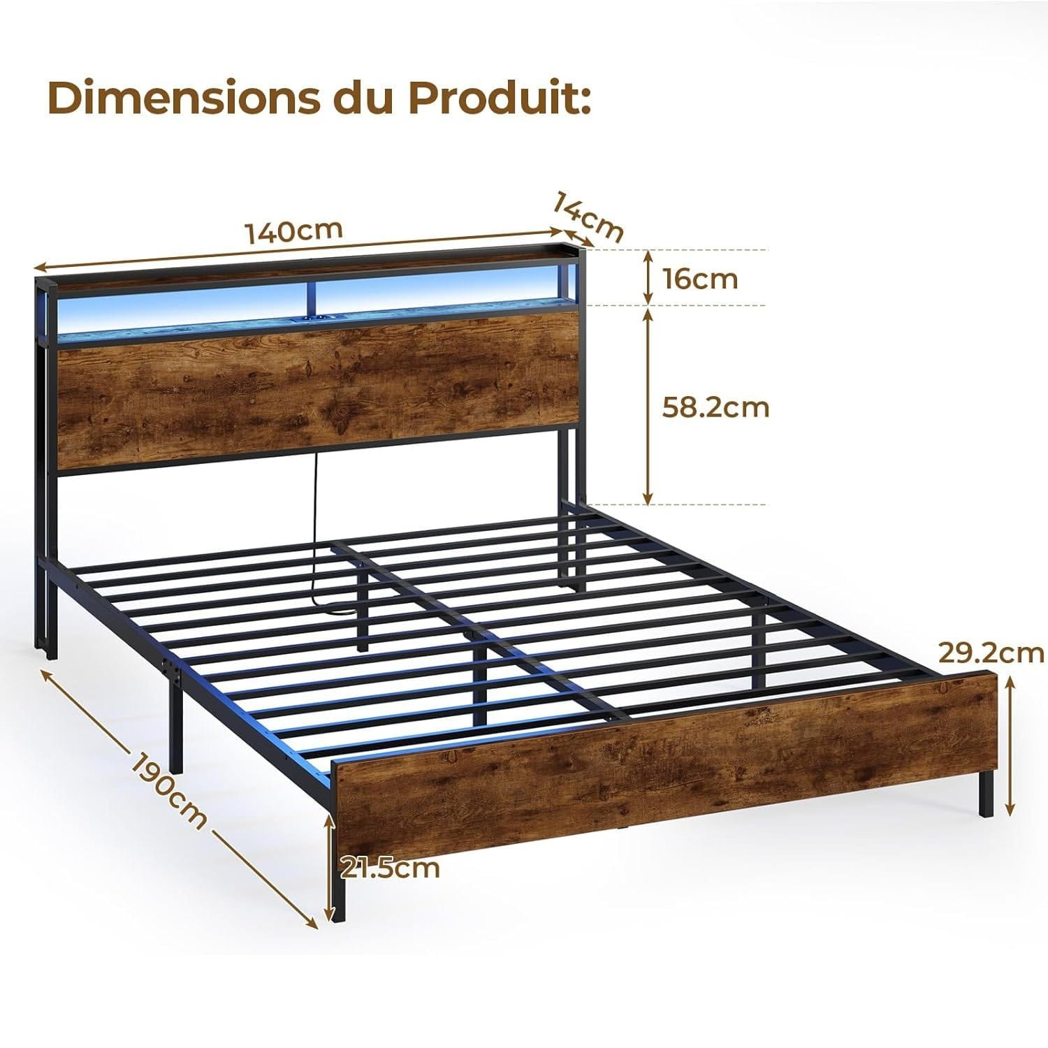 Cadre de Lit en Métal avec Tête de Lit de Rangement LED Multiprise Espace de Rangement sous le Lit Marron