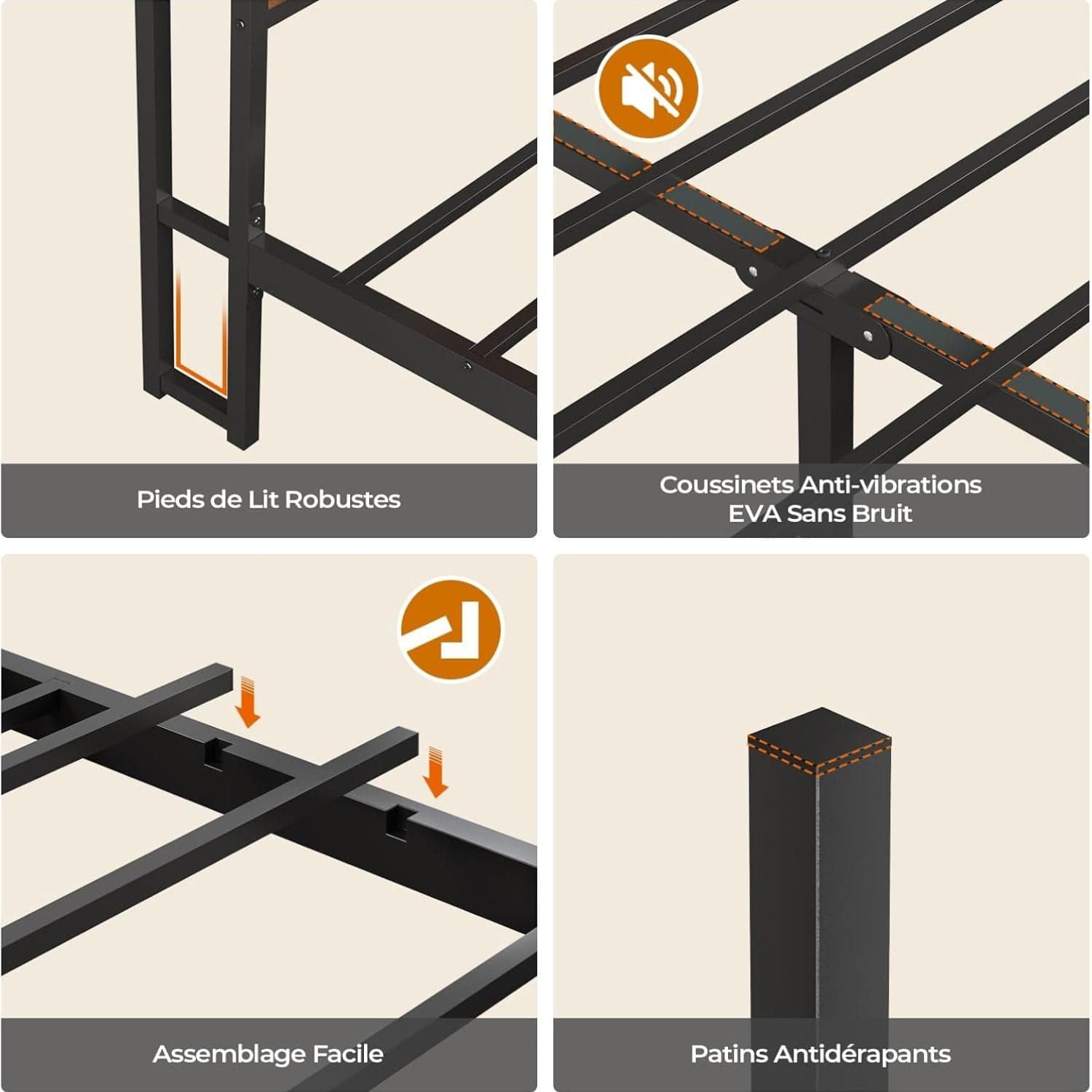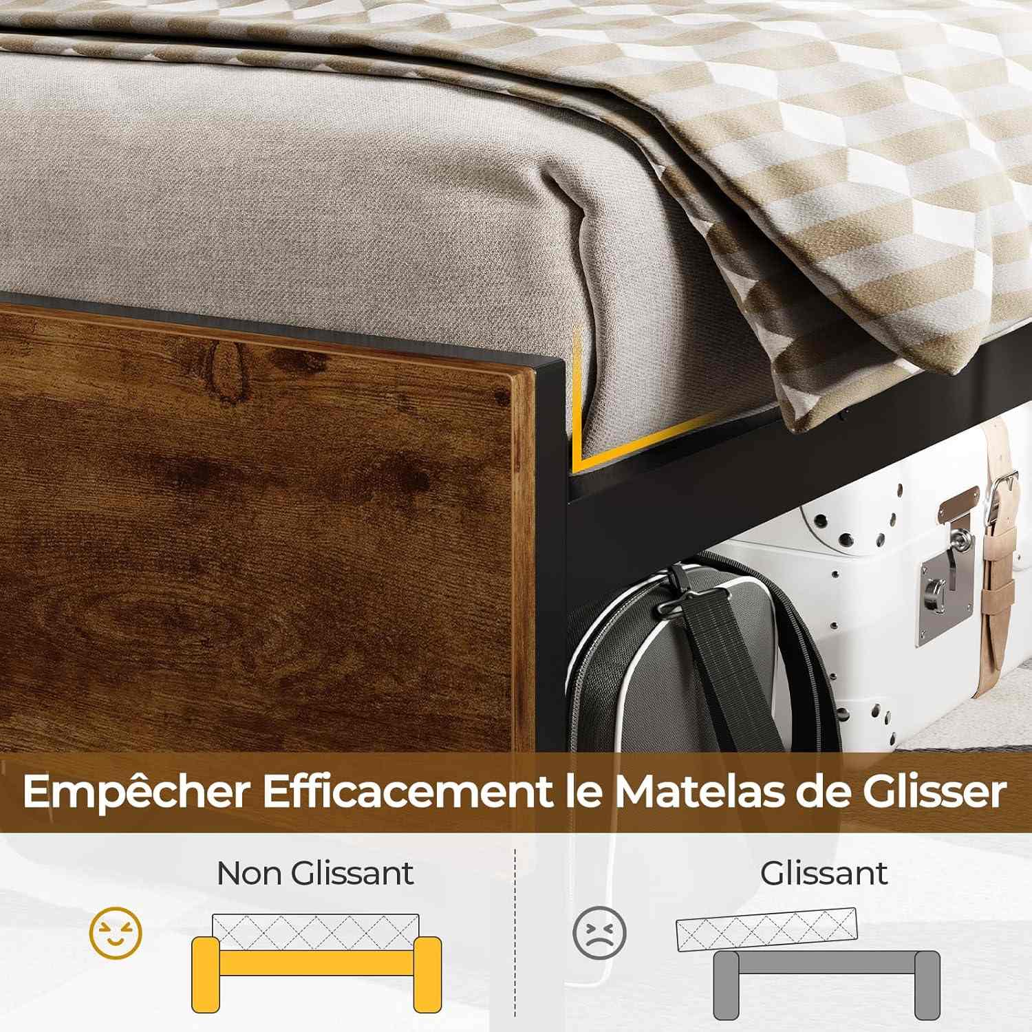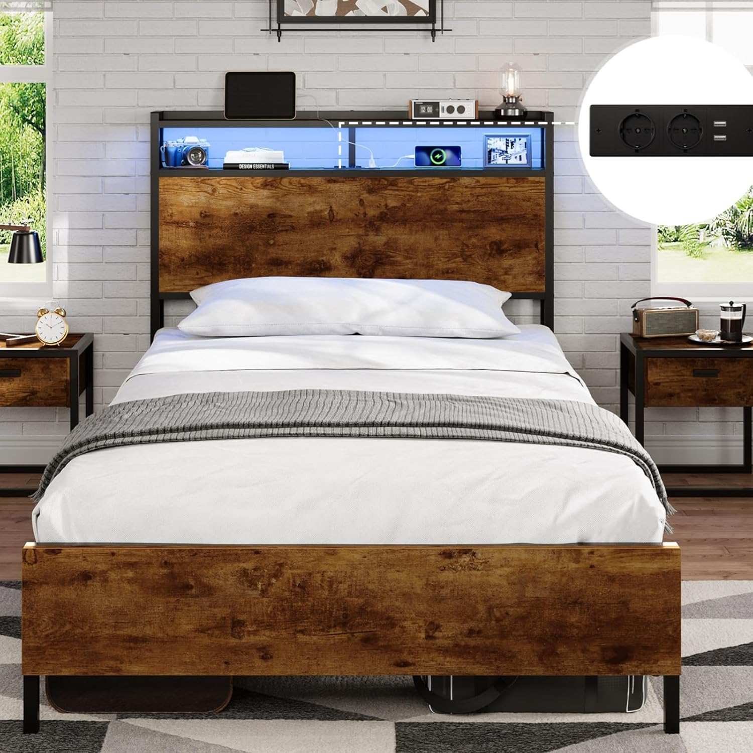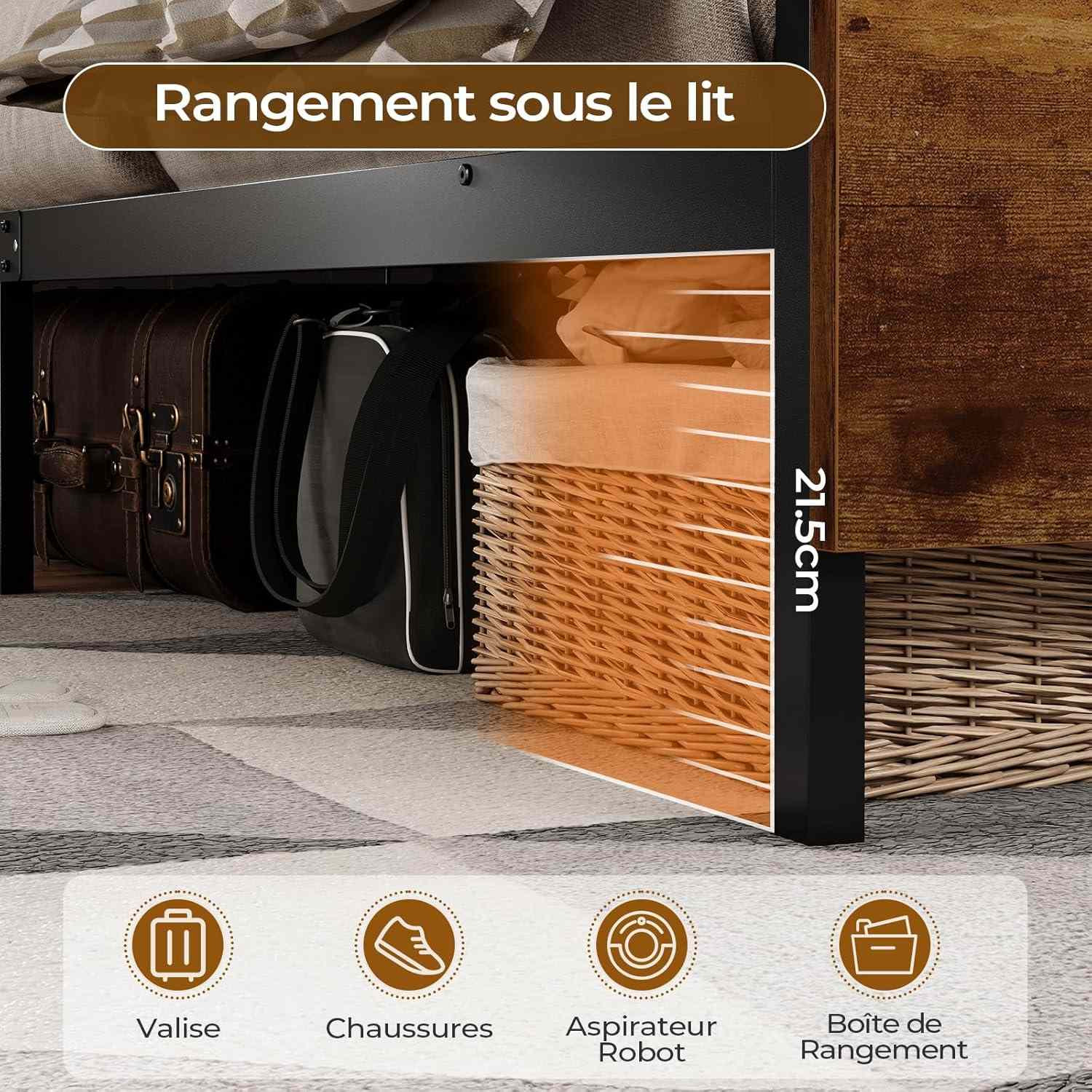 Cadre de Lit en Métal avec Tête de Lit de Rangement LED Multiprise Espace de Rangement sous le Lit Marron