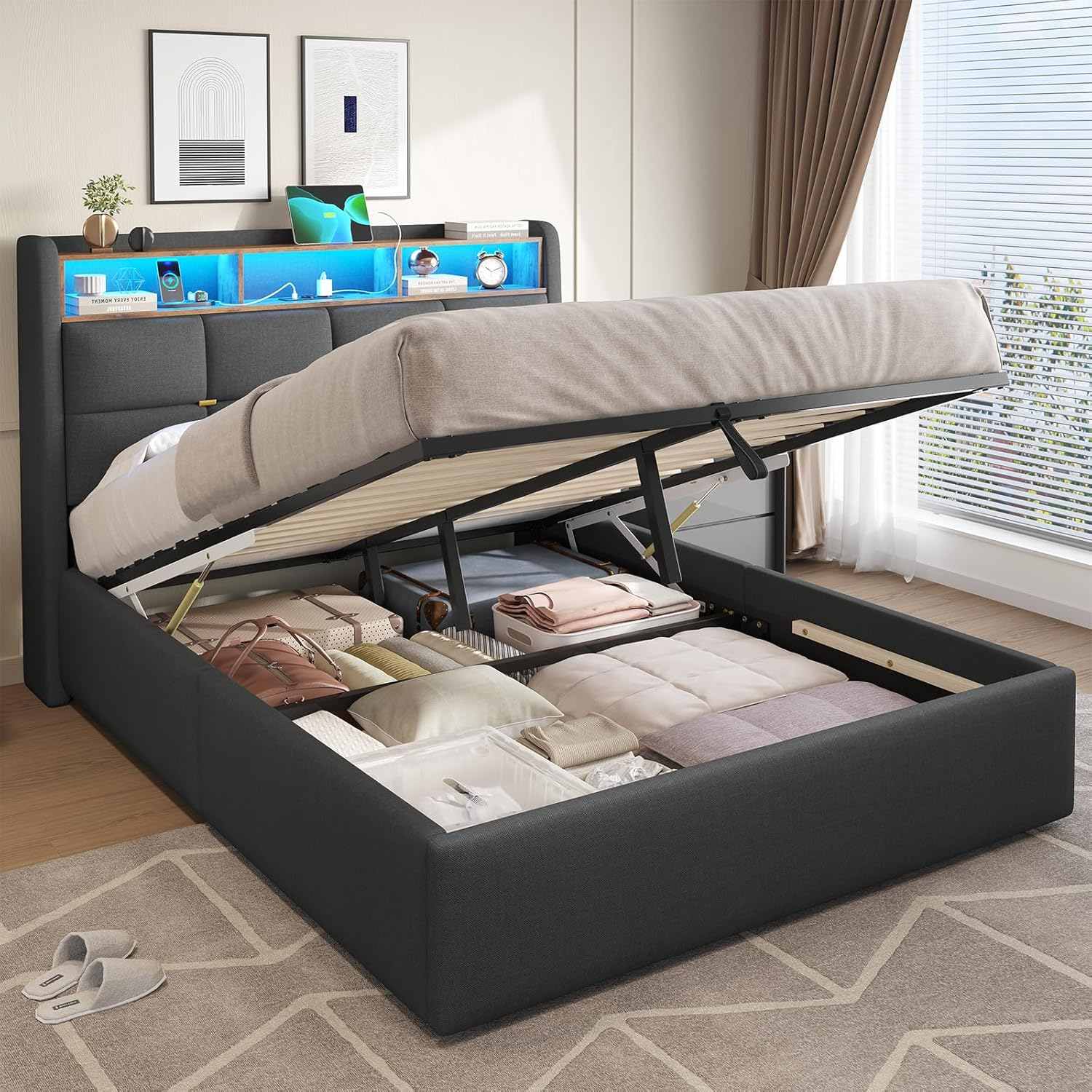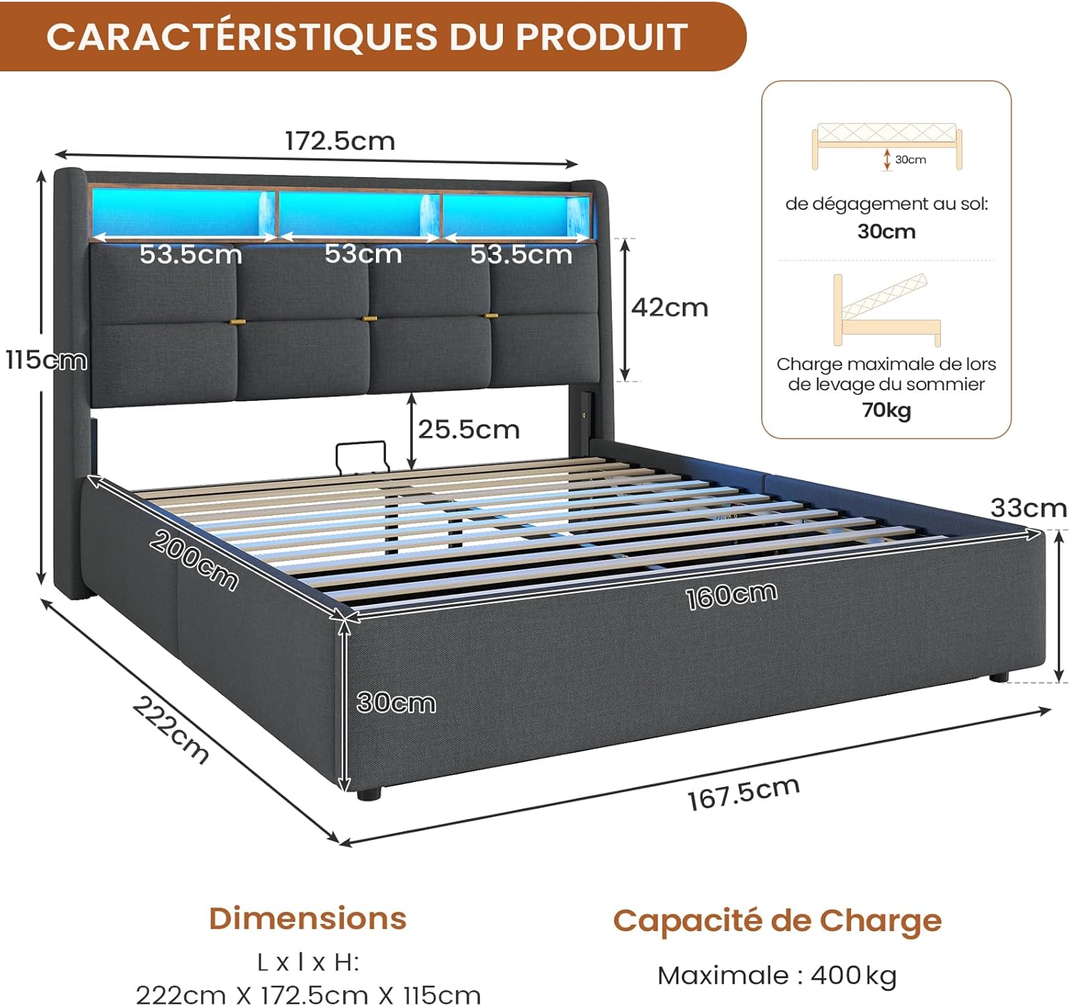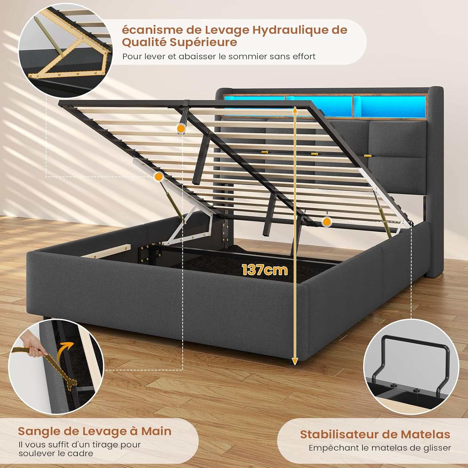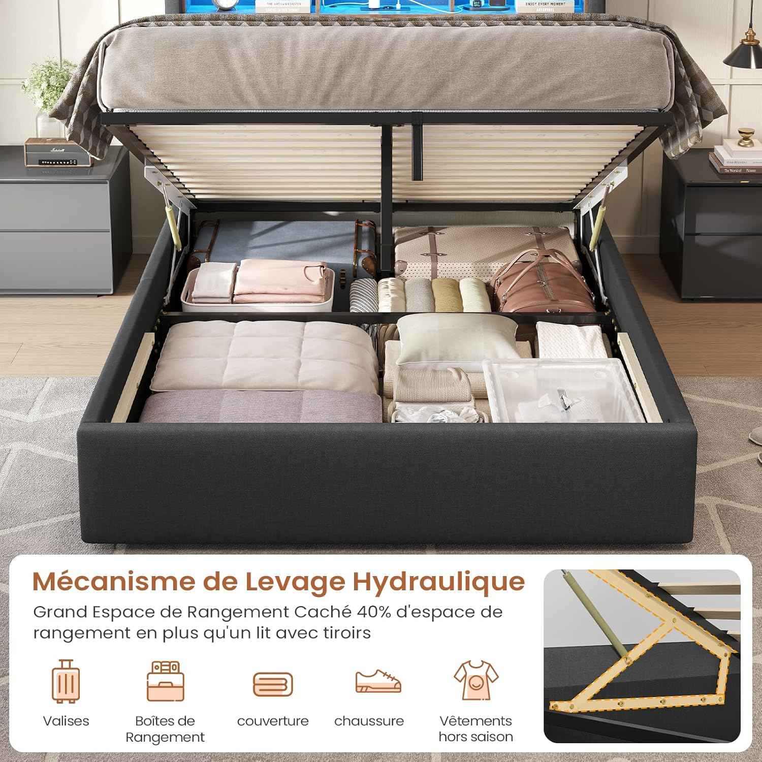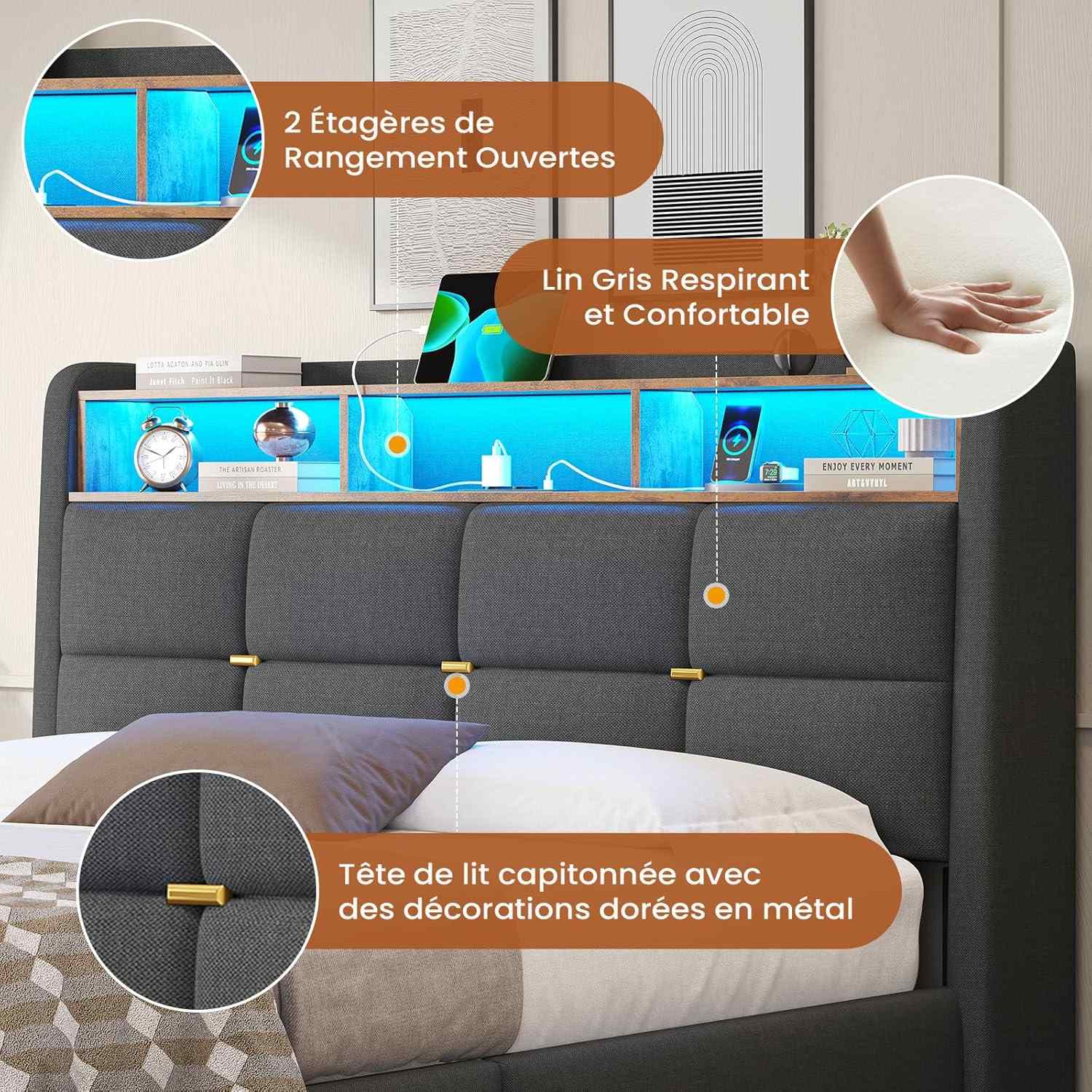 Cadre de Lit en Lin avec Lumières LED et Prise Sommier à Lattes et Rangement Hydraulique Gris