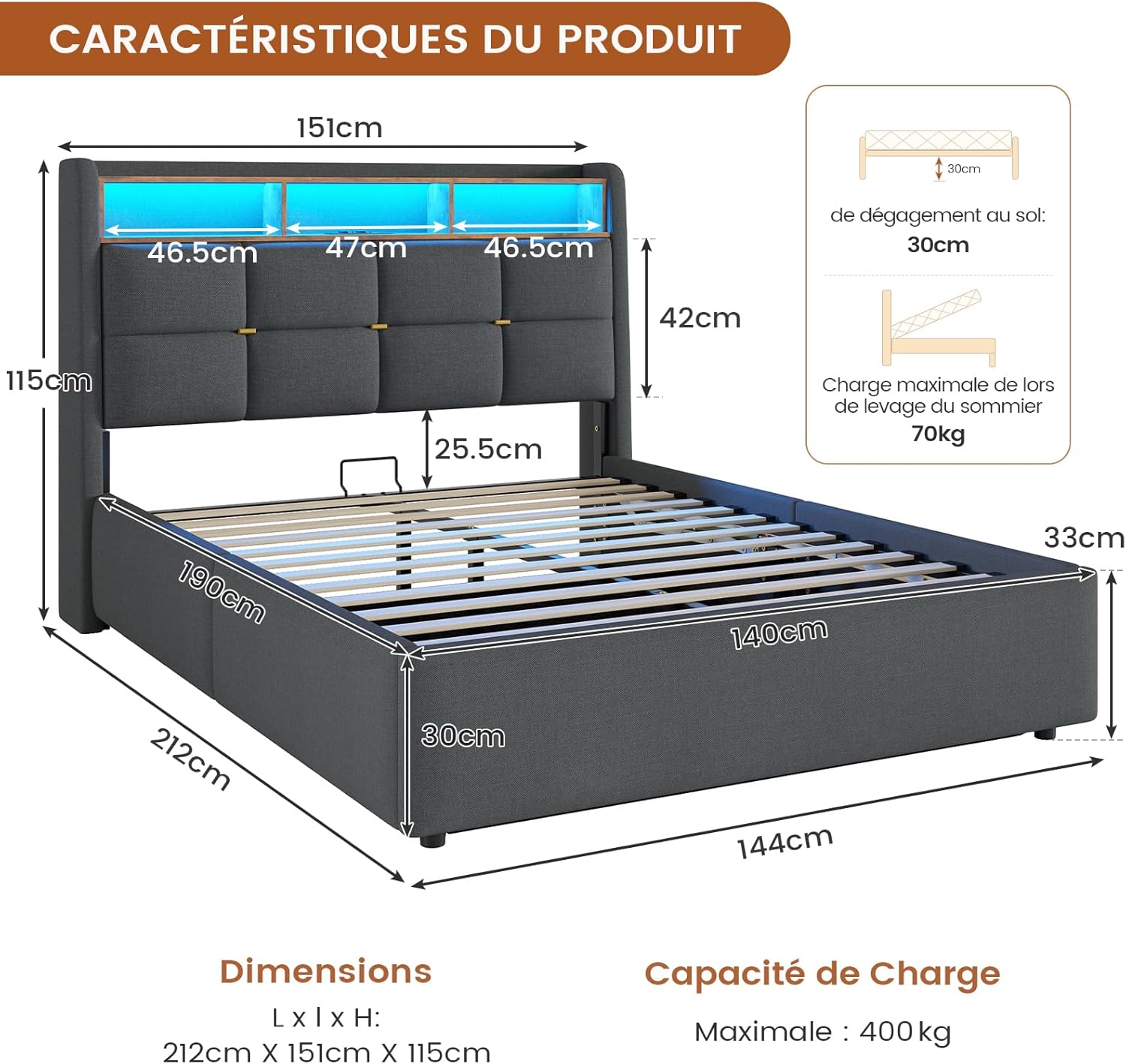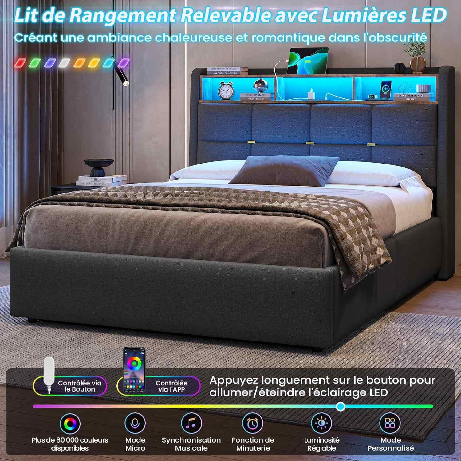 Cadre de lit avec rangement est équipé d'un ruban LED RGB vibrant, la couleur peut être réglable par le bouton ou l'APP. Vous pouvez également personnaliser plus de couleurs (plus de 60 000 couleurs au choix), la luminosité, mode d'éclairage, mode Micro, synchronisation musicale et fonction de minuterie via l'APP. Ajoutez des éléments colorés et immersifs à votre pièce en optant pour ces lits et cadre de lit pour adulte !