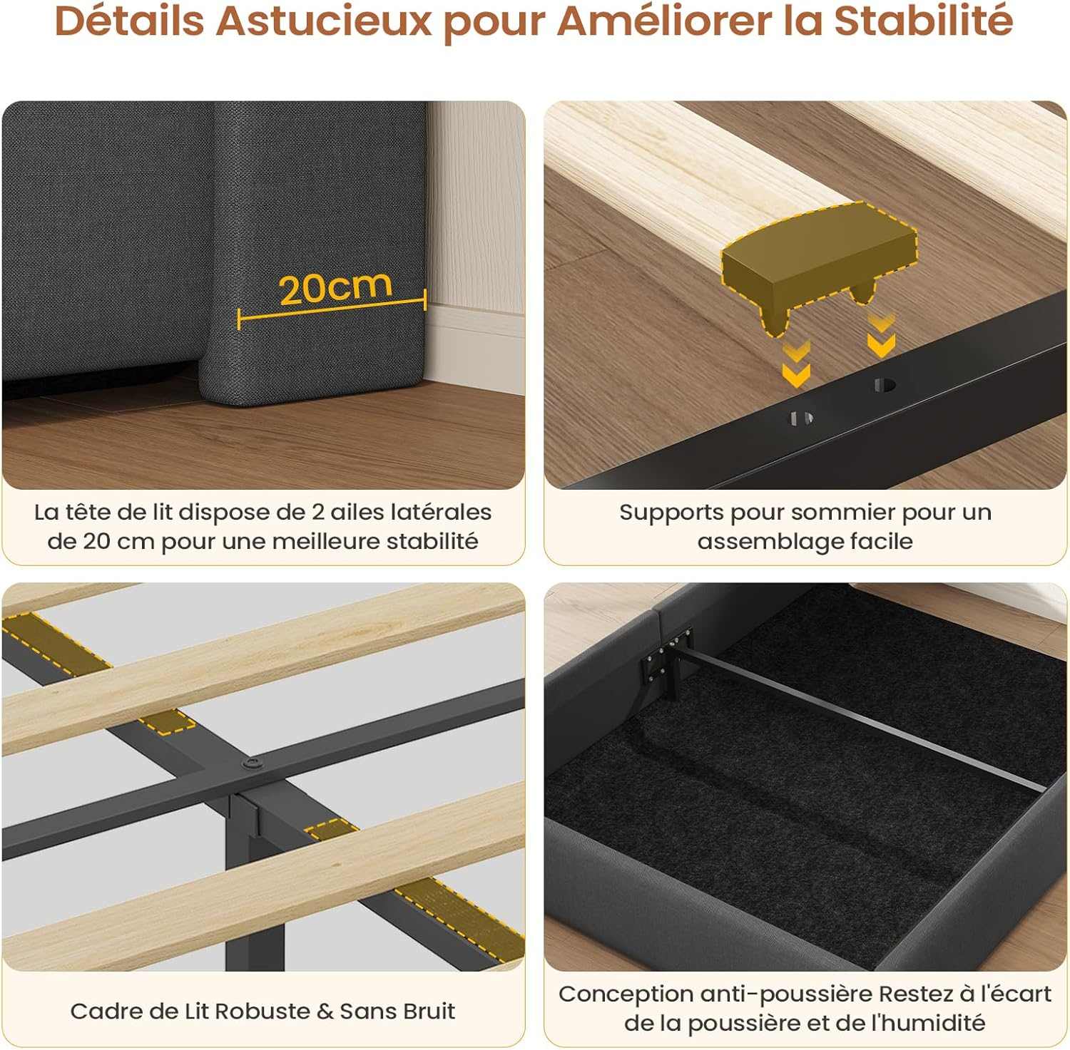 Avec la tête de lit rembourrée, ailes de renfort latérales classiques et décorations dorées en métal, ce lit avec LED et USB apportera une touche esthétique et cosy chez vous. La tête de lit avec 2 ailes latérales empêchera votre matelas de glisser et oreiller de tomber, offrant un soutien agréable pour vous asseoir au cadre de lit. Ce lit coffre en lin gris sera plus doux, respirant et résistant, s’adaptant à tous les styles d'intérieur.