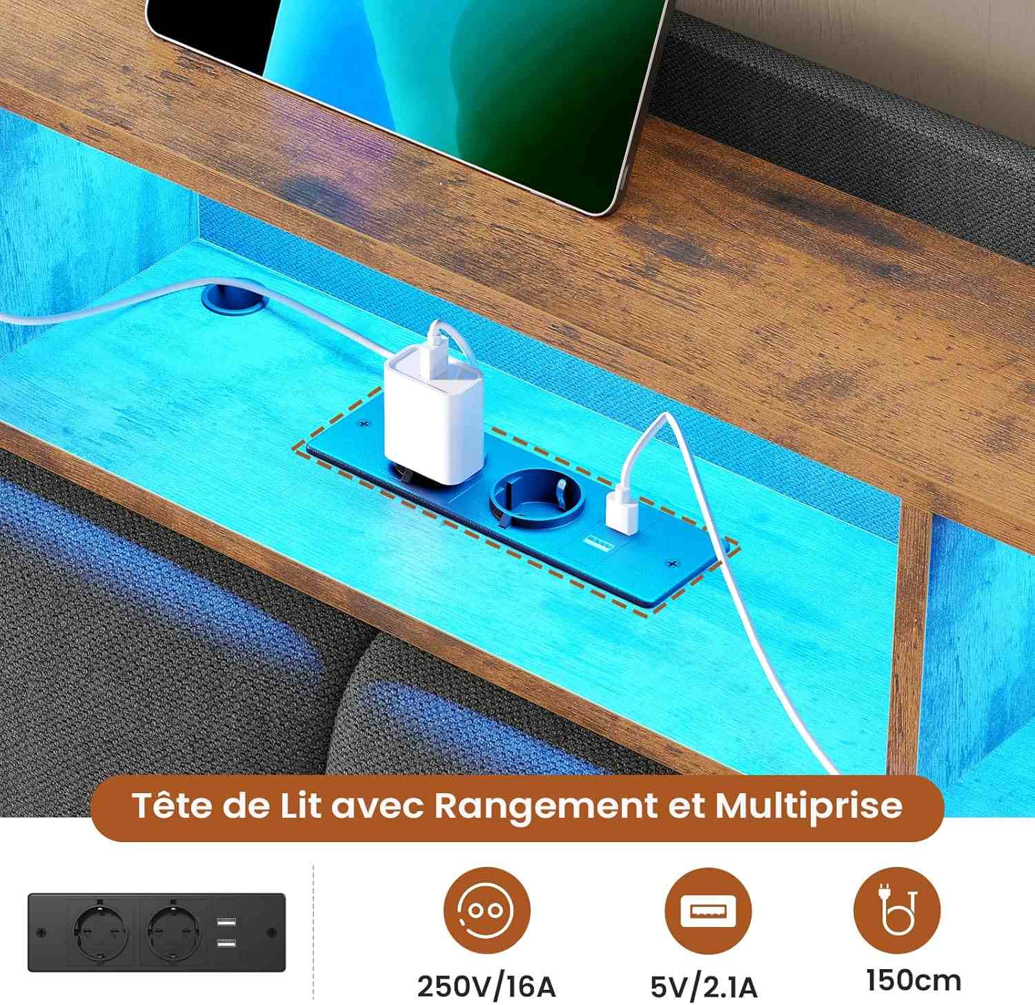 Tête de lit à rangement capitonnée avec prise intégrée, Inclure 2 prises AC et 2 ports USB, pratique pour charger votre téléphone, iPad, vos portables, lampe de bureau et autres appareils.2 étagères de rangement, vous aurez vos lunettes, télécommande, livres, etc. sont à portée de main. Profitez sereinement de vos moments de détente avec le portable sur ce lit pour adulte !