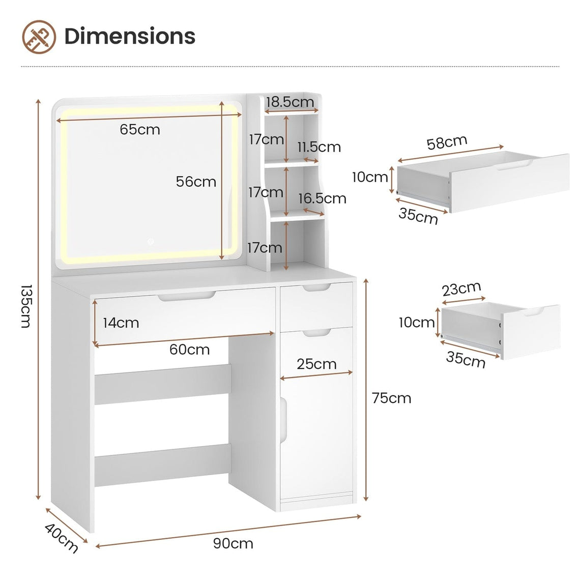 Coiffeuse avec Éclairage LED et Miroir 3 Tiroirs de Rangement 3 Étagères et 1 Armoire Blanc